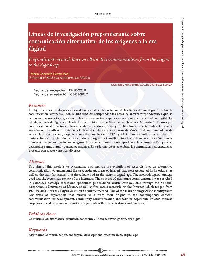 Lemus, M. C. (2017). Líneas de investigación preponderantes sobre comunicación alternativa: de los orígenes a la era digital. Revista Internacional de Comunicación y Desarrollo. 2(5) Pp. 49-66 http://dx.doi.org/10.15304/ricd.2.5.3417