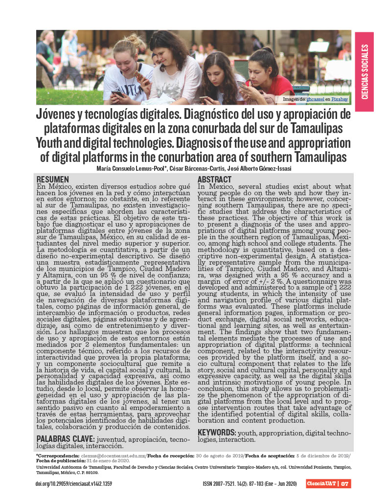 Lemus, M.C., Bárcenas, C. & Gómez, J. A. (2020). Jóvenes y tecnologías digitales. Diagnóstico del uso y apropiación de plataformas digitales en la zona conurbada del sur de Tamaulipas. CienciaUAT. 14(2). 83-103 https://doi.org/10.29059/cienciauat.v14i2.1359