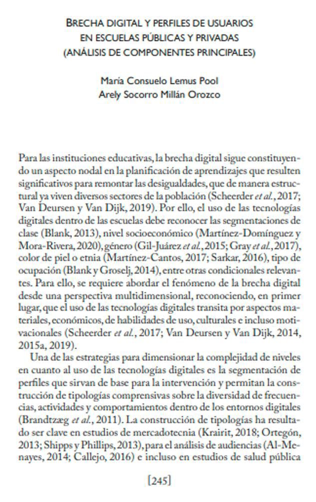 Lemus, M.C. & Millán, A. (2021) Brecha digital y perfiles de usuarios en escuelas públicas y privadas (análisis de componentes principales). En Ortiz-G. & Palmas, S. (Coords). Investigación cualitativa y cuantitativa en educación y cultura digital. Métodos y perspectivas (pp. 245-272). UAM.