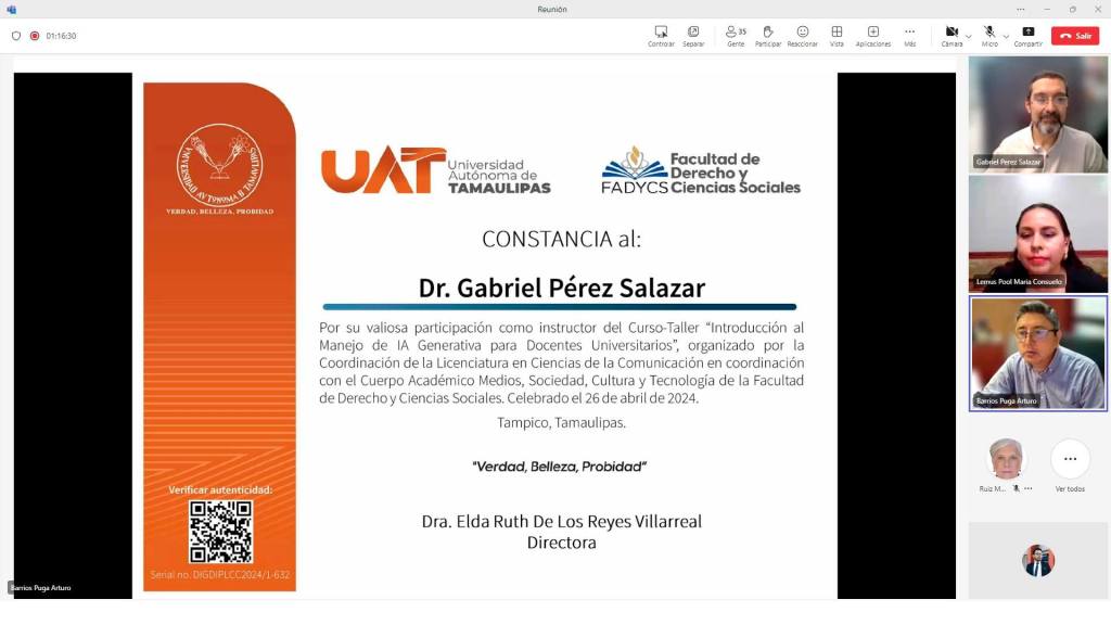 El Cuerpo Académico Medios Sociedad Cultura y Tecnología ha dado un paso significativo hacia la vanguardia del conocimiento con la reciente realización del curso/taller «Introducción al manejo de IA generativa para docentes universitarios». Impartido magistralmente por el Dr. Gabriel Pérez Salazar de la Universidad Autónoma de Coahuila, este evento ha proporcionado a los participantes una sólida base en el fascinante mundo de la Inteligencia Artificial (IA) generativa.