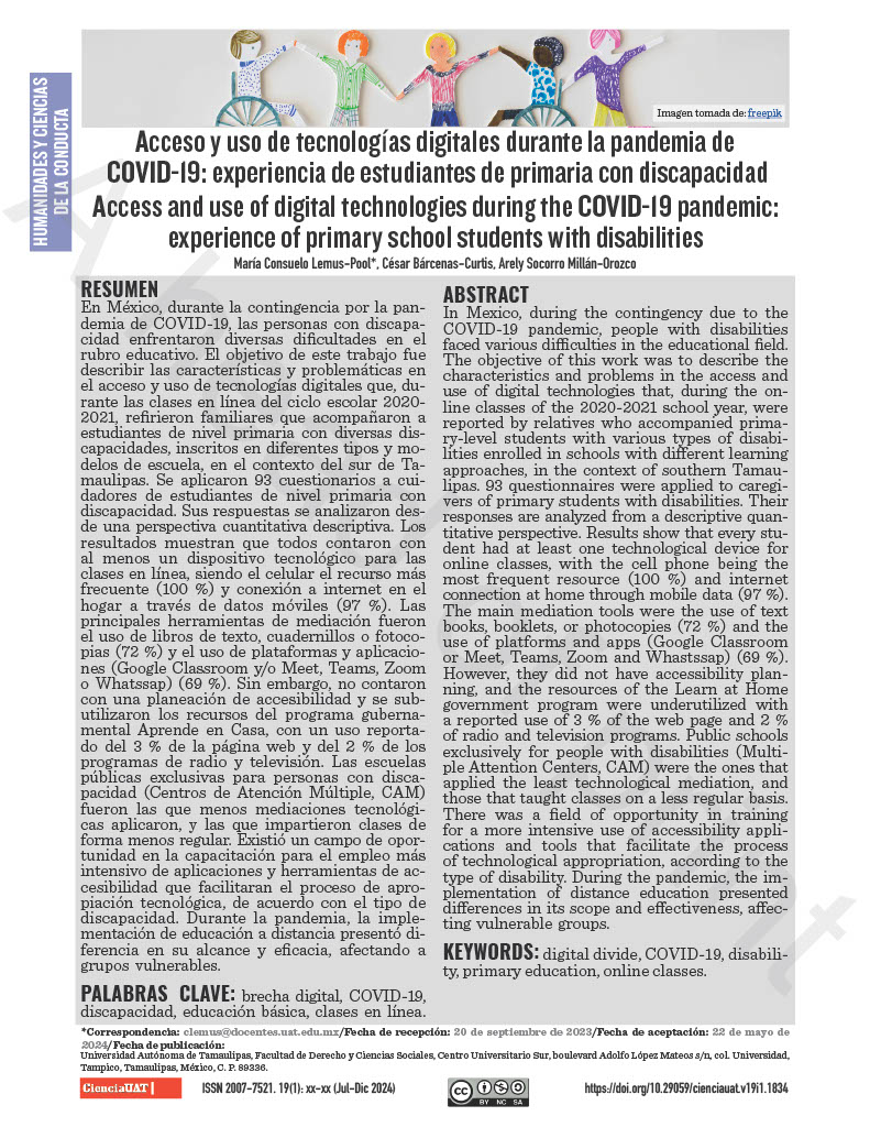 Lemus-Pool, M.C., Bárcenas, C., & Millán, A.S. (2024). Acceso y uso de tecnologías digitales durante la pandemia de COVID-19: experiencia de estudiantes de primaria con discapacidad. CienciaUAT, 19(1), 85-102. https://doi.org/10.29059/cienciauat.v19i1.1834