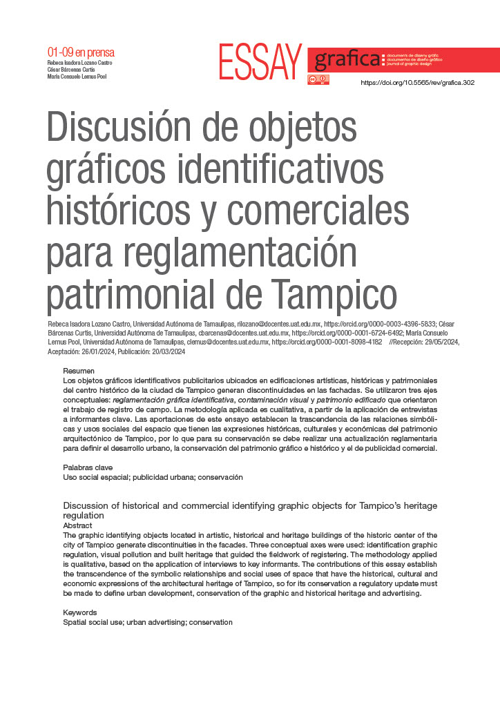LLozano, R.I., Bárcenas, C., & Lemus-Pool, M.C. (2024). Discusión de objetos gráficos identificativos históricos y comerciales para reglamentación patrimonial de Tampico. Gráfica, https://doi.org/10.5565/rev/grafica.302