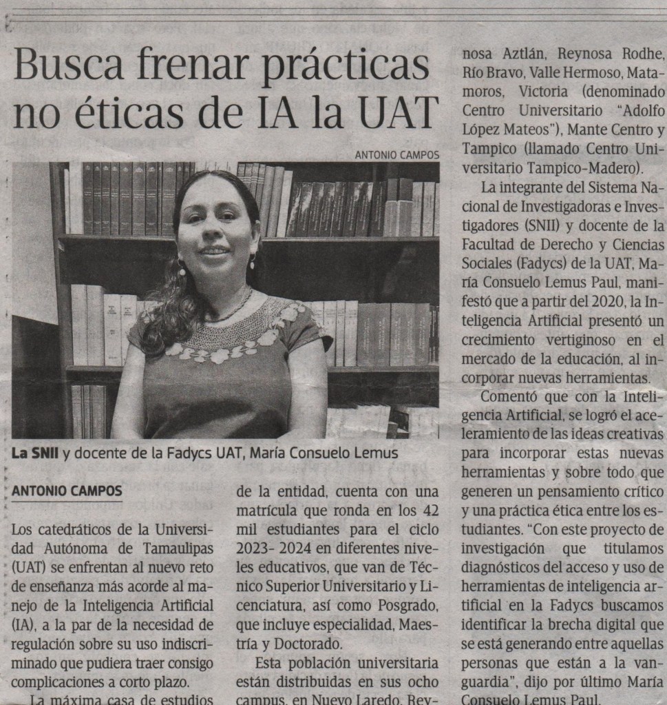 La Dra. María Consuelo Lemus Pool, miembro del cuerpo académico CAMSCyT, fue entrevistada por el periódico El Sol de Tampico. Durante la charla, compartió cómo la inteligencia artificial ha sido integrada en el ámbito educativo desde 2020, impulsando el desarrollo de ideas creativas en el uso de estas herramientas y promoviendo un pensamiento más crítico en su aplicación.