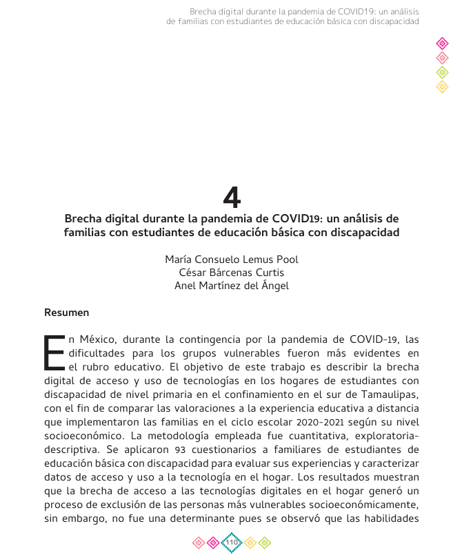 Lemus-Pool, M.C., Bárcenas, C., & Martínez, A. (2025). Brecha digital durante la pandemia de COVID19: un análisis de familias con estudiantes de educación básica con discapacidad. En F. Gervasi & G. Pérez-Salazar (Coods.). Afirmación, negociación y negación de identidades en las intersecciones entre cultura y tecnología: reflexiones teóricas e investigaciones empíricas (Pp. 110-141). Universidad Autónoma de Coahuila.