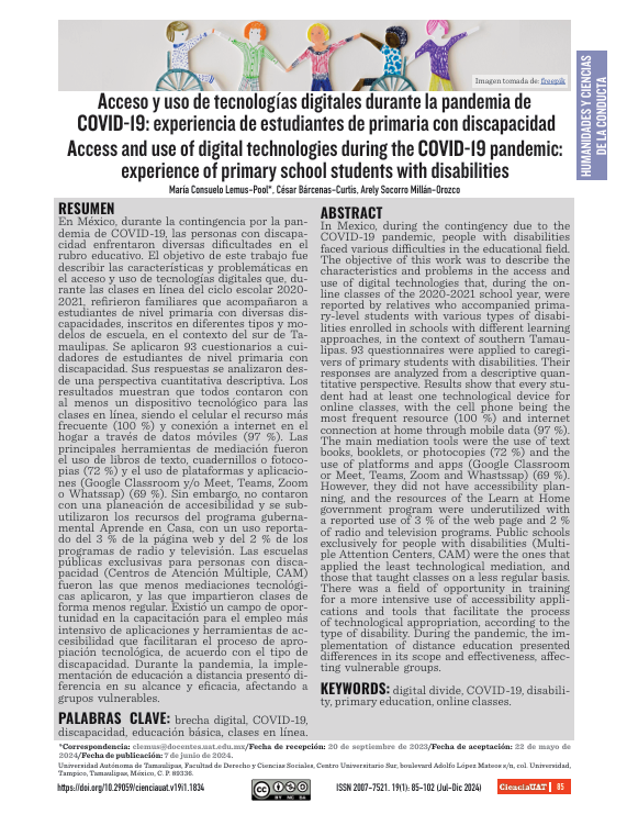 Lemus-Pool, M.C., Bárcenas, C., & Millán, A.S. (2024). Acceso y uso de tecnologías digitales durante la pandemia de COVID-19: experiencia de estudiantes de primaria con discapacidad. CienciaUAT, 19(1), 85-102. https://doi.org/10.29059/cienciauat.v19i1.1834