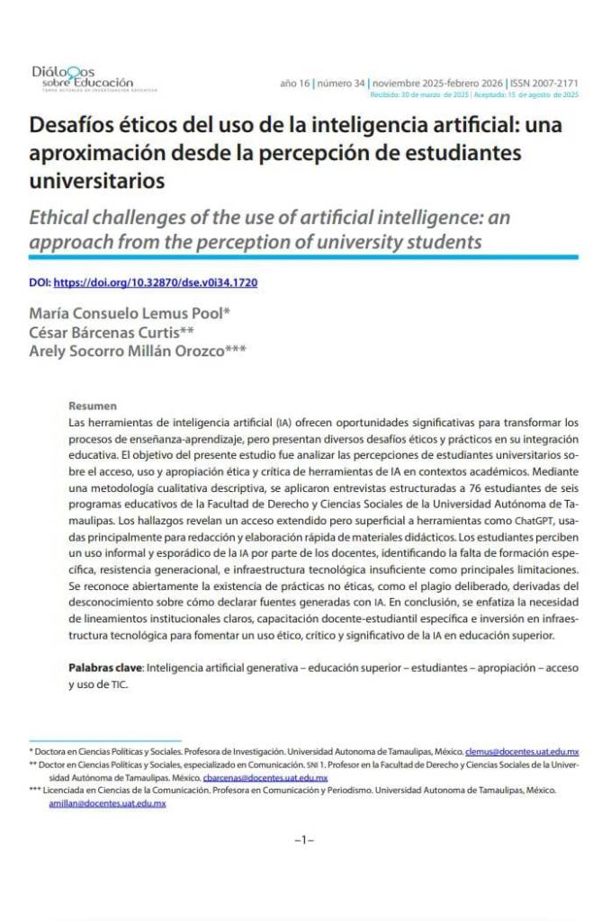 Lemus-Pool, M. C., Bárcenas-Curtis, C., & Millán-Orozco, A. S. (2025). Desafíos éticos del uso de la inteligencia artificial. Una aproximación desde la percepción de estudiantes universitarios. Diálogos sobre Educación. Temas actuales en investigación educativa, 34(16), 1-24. https://doi.org/10.32870/dse.v0i34.1720