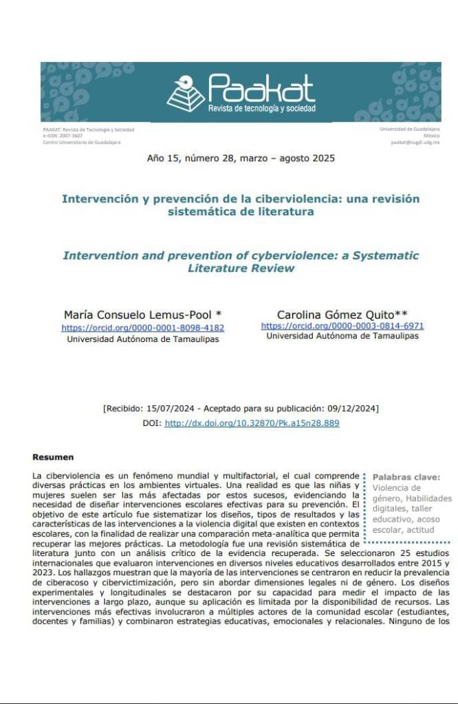 literatura junto con un análisis crítico de la evidencia recuperada. Se seleccionaron 25 estudios internacionales que evaluaron intervenciones en diversos niveles educativos desarrollados entre 2015 y 2023. Los hallazgos muestran que la mayoría de las intervenciones se centraron en reducir la prevalencia de ciberacoso y cibervictimización, pero sin abordar dimensiones legales ni de género. Los diseños