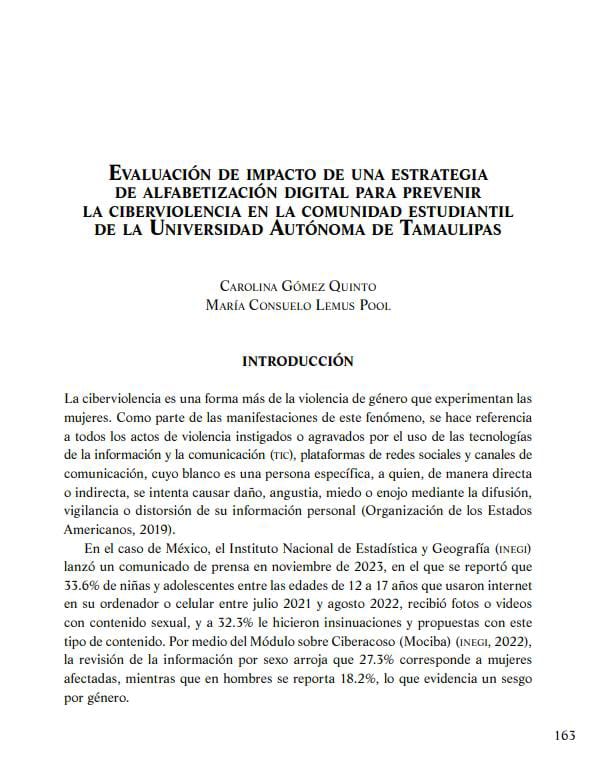 Gómez, C., & Lemus-Pool, M.C. (2025). Evaluación de impacto de una estrategia de alfabetización digital para prevenir la ciberviolencia en la comunidad estudiantil de la Universidad Autónoma de Tamaulipas . En G. Ortiz-Henderson, R. López, & Garay, L.M. (Coord.). Alfabetización y autocuidados digitales. Estrategias de intervención en la comunidad estudiantil universitaria (Pp. 163-184). Universidad Veracruzana, Universidad