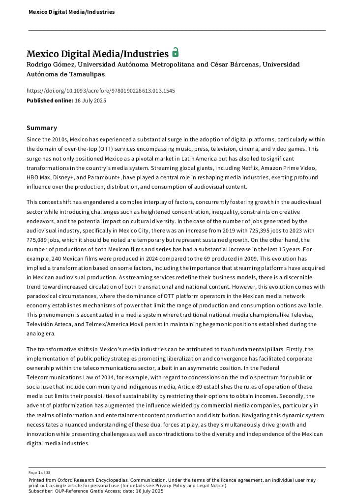 Gómez, R., & Bárcenas, C. (2025, July 16). Mexico Digital Media/Industries. Oxford Research Encyclopedia of Communication. https://doi.org/10.1093/acrefore/9780190228613.013.1545